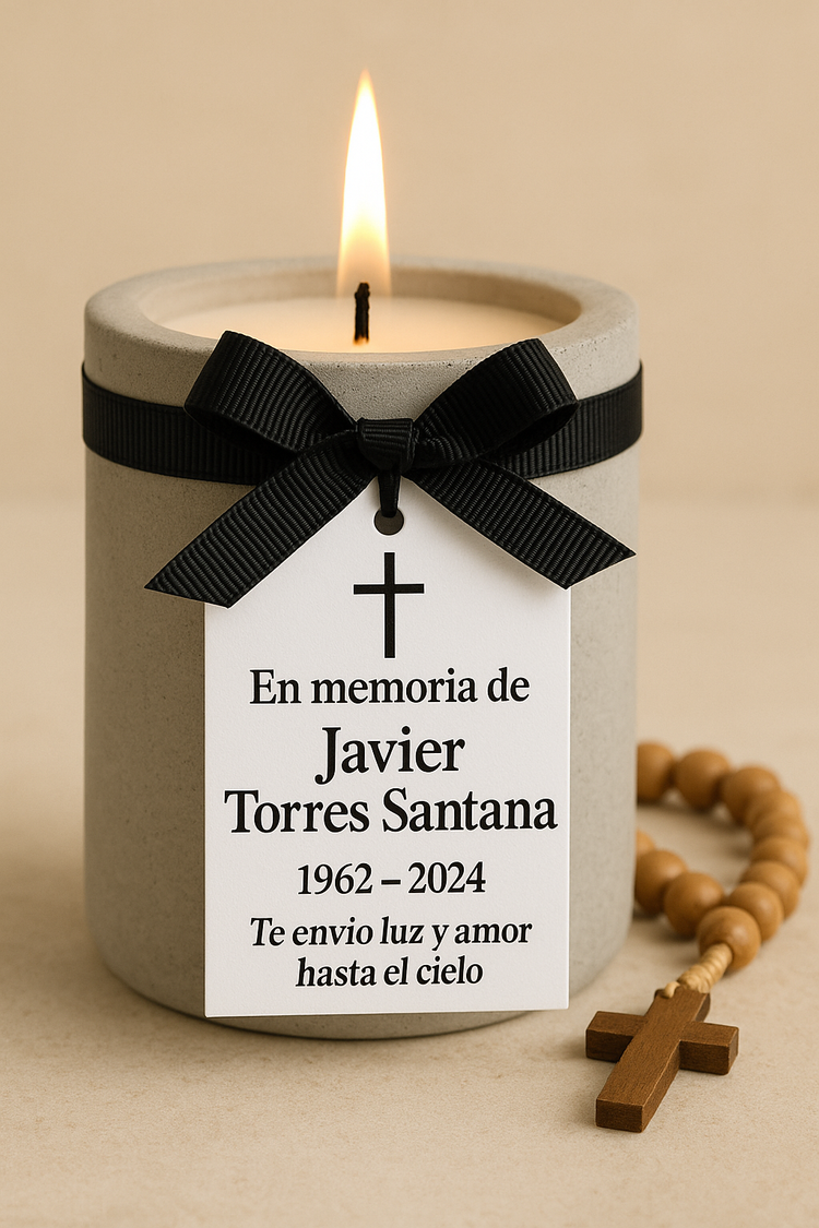 Velas artesanales con esencia atemporal, contenedores de inspiración pétrea —como granito o mármol— y mensajes que acompañan el alma en días de recuerdo.