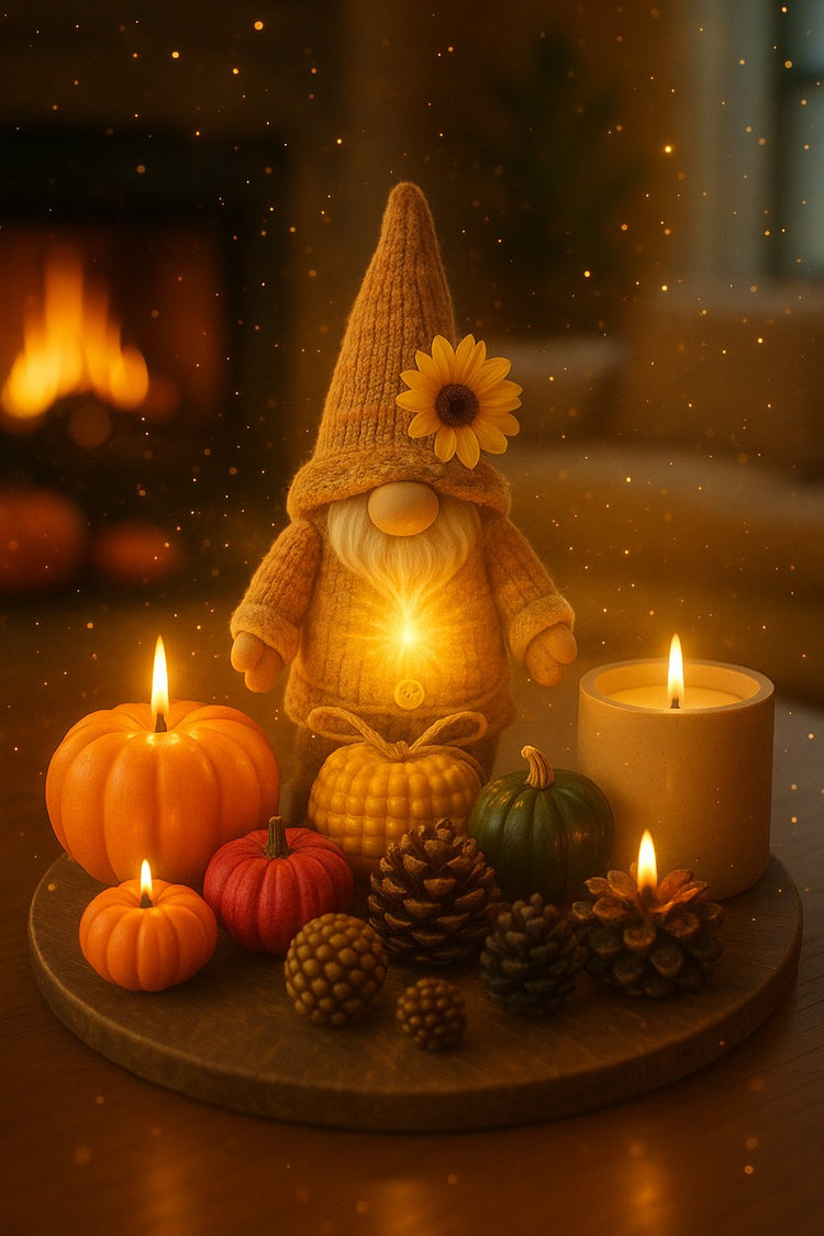 🍄 Set de Gnomo de Otoño – Una vela inspirada en este pequeño guardián de la cosecha, con un aroma acogedor que transforma cualquier espacio en un refugio otoñal.