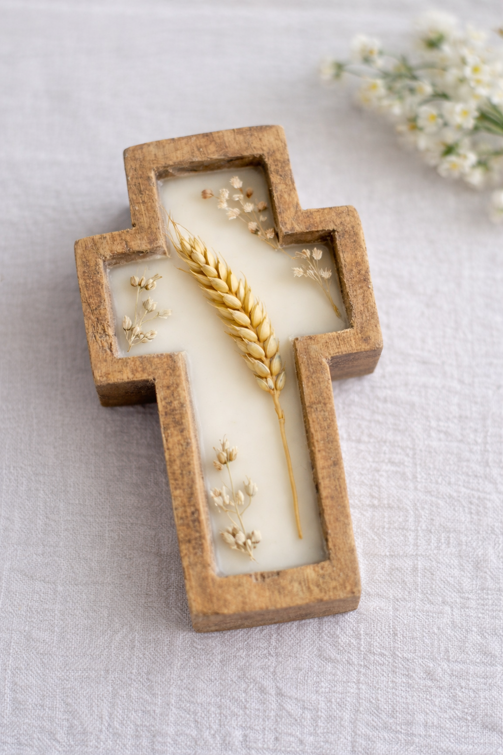 ruz artesanal con cera aromatizada, decorada con espiga natural y flores secas en tonos beige. Diseñada como recuerdo ceremonial, este sachet acompaña desde la suavidad del aroma y el simbolismo del trigo como signo de vida, fe y gratitud.